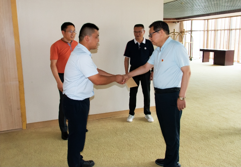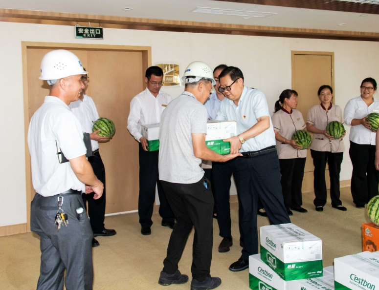 隨后,吳傳彪一行查看了酒店客房維修及餐廳改造情況,與現(xiàn)場(chǎng)工作人員親切交流,并為一線員工送去礦泉水、西瓜等防暑降溫物資,叮囑他們?cè)诟邷靥鞖庀乱⒁庑菹?、勞逸結(jié)合。