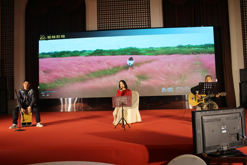 (圖為宏利達(dá)公司綜合管理部表演的吉他彈唱《風(fēng)吹麥浪》)
