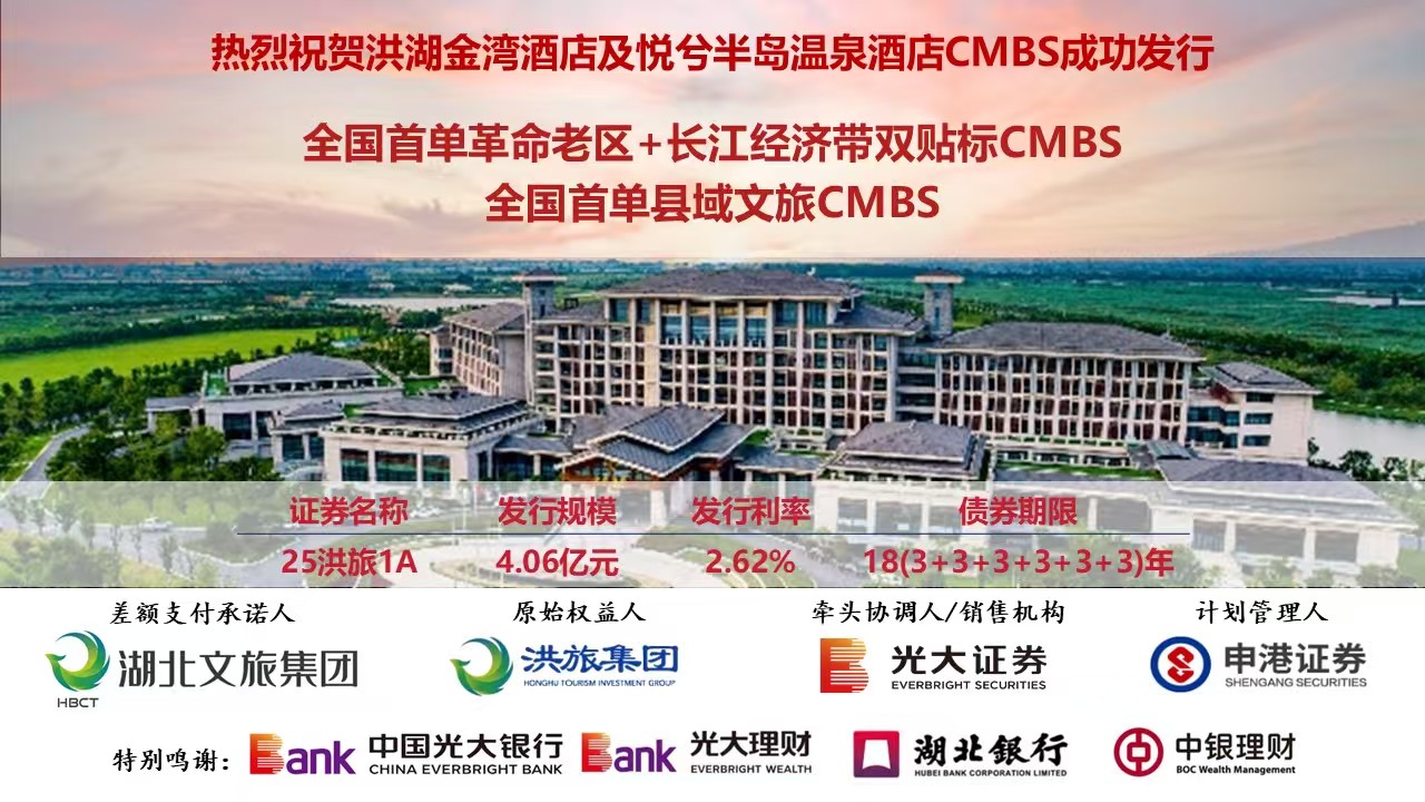 4月28日,湖北文旅集團旗下洪湖旅游集團在上交所成功發(fā)行申港光大-金灣酒店及半島溫泉酒店資產(chǎn)支持專項計劃(革命老區(qū)/長江經(jīng)濟帶),發(fā)行金額4.07億元(含次級份額100萬元),期限18年(3+3+3+3+3+3),票面利率2.62%,為全國首單革命老區(qū)+長江經(jīng)濟帶雙貼標CMBS證券化產(chǎn)品,也是全國首單縣域文旅項目CMBS(商業(yè)房地產(chǎn)抵押貸款支持證券)。